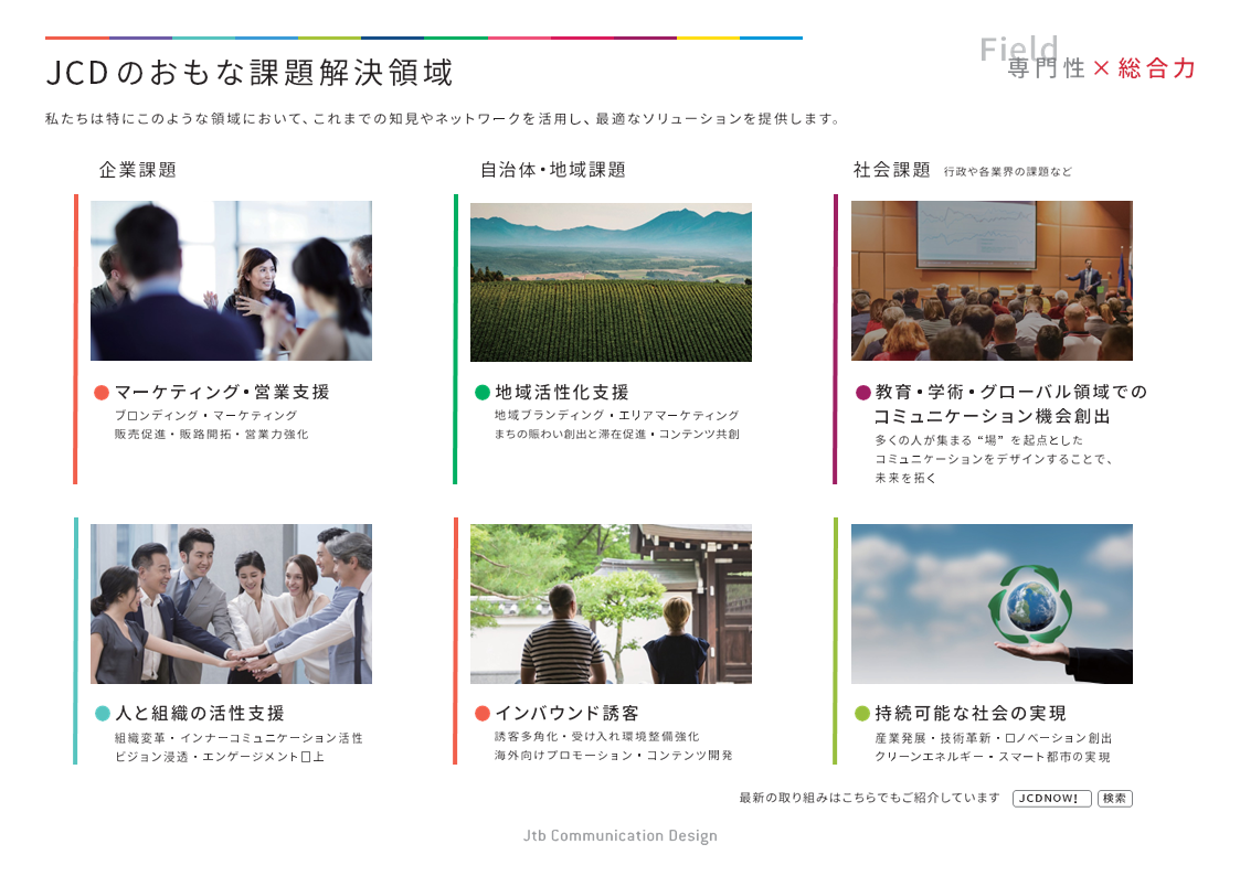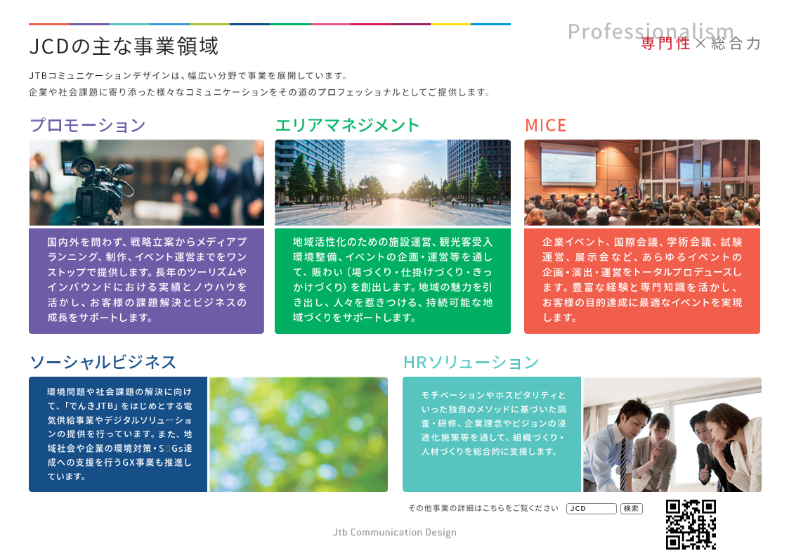 JTBコミュニケーションデザイン(JCD)は、コミュニケーション領域のプロフェッショナルとして、プロモーション・地域活性・MICE・組織人材開発・コンテンツ創出など幅広い分野で事業を展開しています。